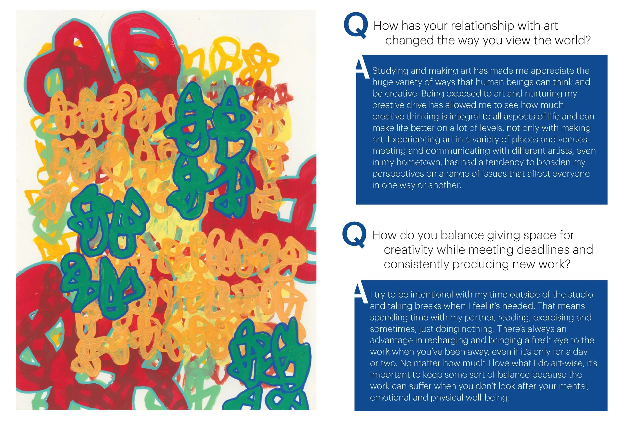 Tim McFarlane is a painter based in Philadelphia, PA. His paintings and works on paper examine the fluid and contradictory nature of memory and place, with an emphasis on color, multi-layered systems and process. His practice has extended to include wall-based painting and drawing installations as well. Much of his work is informed by everyday observations of the visual impact of human activity and engagement with the outdoor environments of his native Philadelphia.